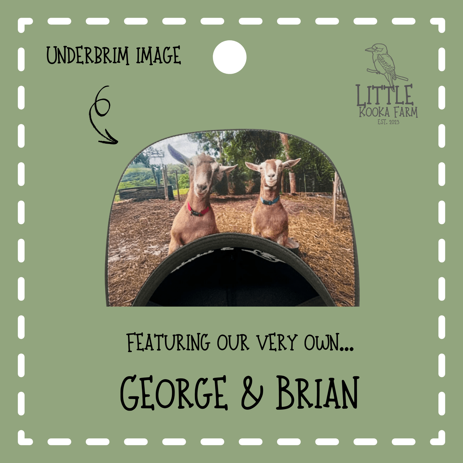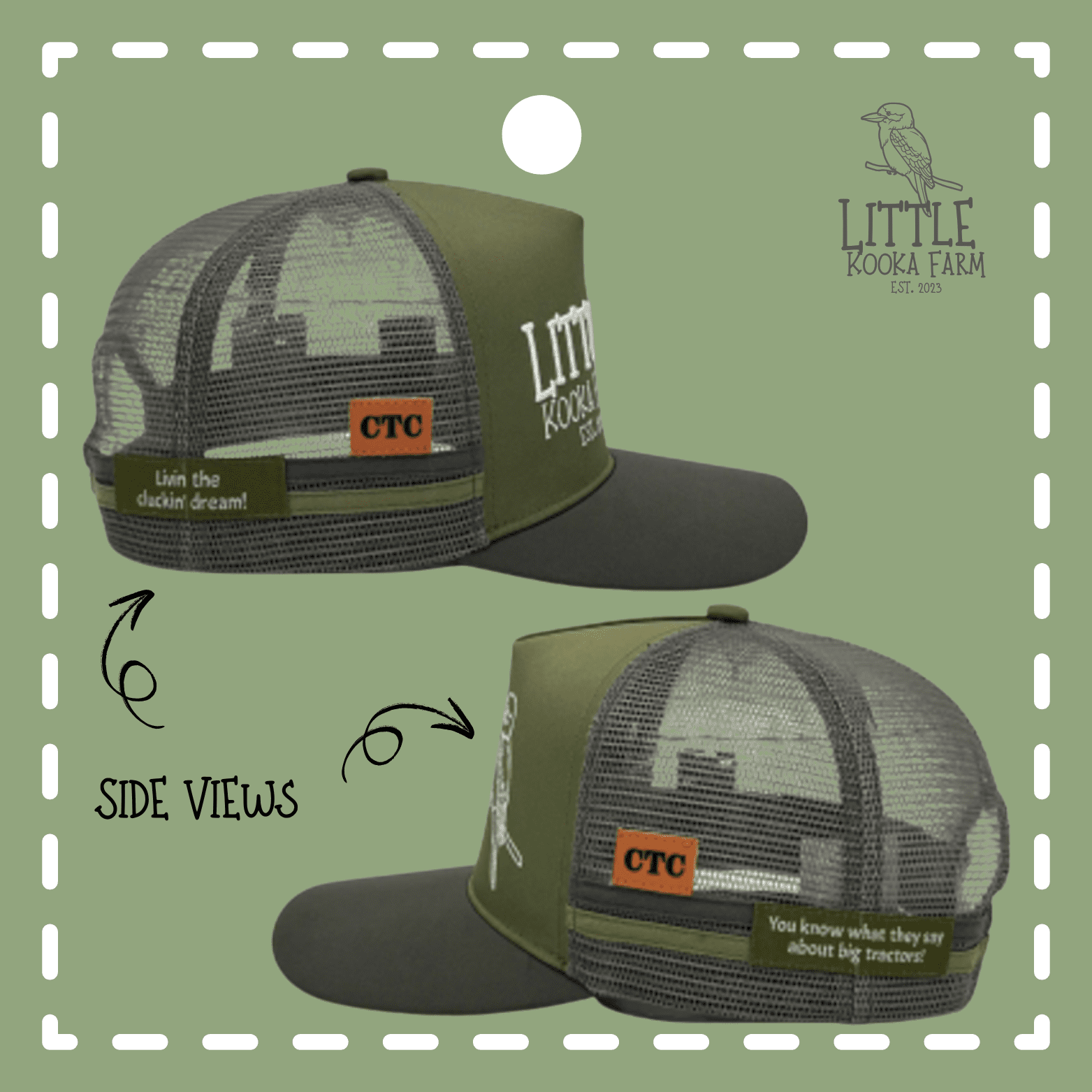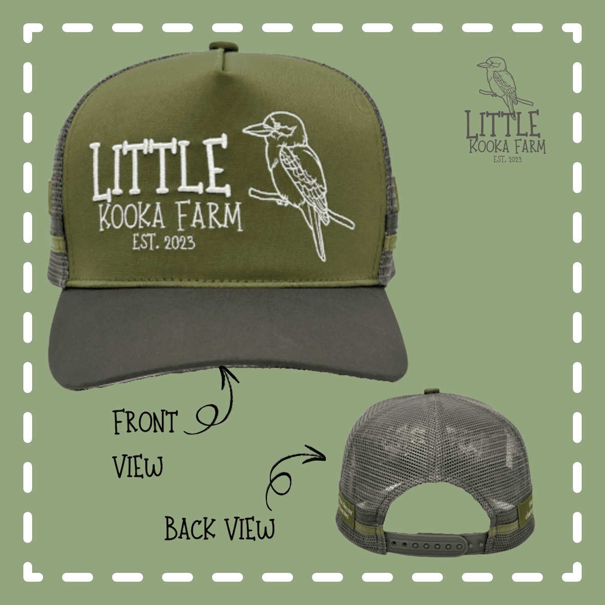 These custom made Trucker Caps are made locally (down the road) in Gympie, Queensland by Country Trucker Caps (CTC) who are well known for their quality products. These caps are constructed with high-quality materials and built to withstand the rough and tumble of country life. They’re durable, lightweight and breathable. Also featuring a CTC Leather Glasses Holder on each side. Little Kooka Farm Logo is high quality, embroided. Sizing of hats are one size fits most: there is a snap back which allows for an adjustable fit to your needs. Measurement is 59 – 62cm and are taken from the circumference of your head above your ears, where the hat would generally sit.